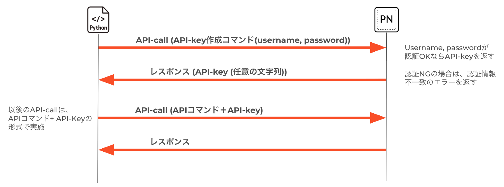 - API経由でコマンドをリクエストする際には、API-key(認証済み情報)が必要になります。誤ったAPI-keyを含めてAPIコマンドを実行した場合、認証エラーとなりリクエストしたAPIコマンドは実行できません。