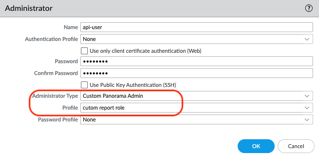 【Panoramaタブ】> Administrators > Add からAdministratorの画面を開き、Administrator Typeで”Custom Panorama Admin”を選択し、ProfileでAPI用アカウントの権限のプロファイルを指定します。
