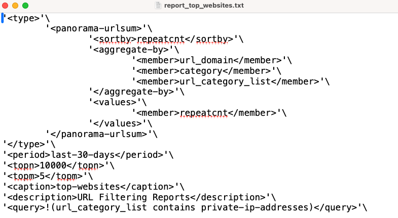カスタムレポートの中身をテキストファイルにする際は、<entry name = “xxxxxxxxxx”> 及び </entry> の部分は不要です。今回作成するスクリプトは、スクリプトを実行する際にカスタムレポートの定義ファイルを読み込み、APIコマンドのクエリーにカスタムレポートの定義内容を含める仕様にしています。別の内容のカスタムレポートを同様に作成し、スクリプトを実行する際にカスタムレポートの定義ファイル部分を変更する(-r オプションで読み込むファイル名を変更する)ことで、対応できるようにしています。