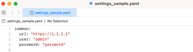 APIを実行する対象のPanoramaの情報をyamlファイルに保存します。yamlファイル内のcommon, url, user, passwordですが、今回のスクリプトでは、それぞれの文字をキーにして値を呼び出してます。(common, url, user, password部分を変更した場合、スクリプト内の該当箇所も合わせて変更して下さい。)