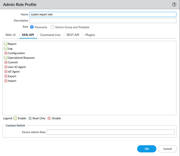 【Panoramaタブ】> Admin Roles > Add からAdmin Role Profileの画面を開き、”XML-API”タブでAPI用のアカウントに付与する権限を選択します。今回の例では、”Report”, “Log”, “Operation Requests”を実行できる権限を付与しています。 APIを実行するのに不要な権限(例 “Web-UI”タブ配下などの操作権限)は、Disable設定とするのが推奨になります。