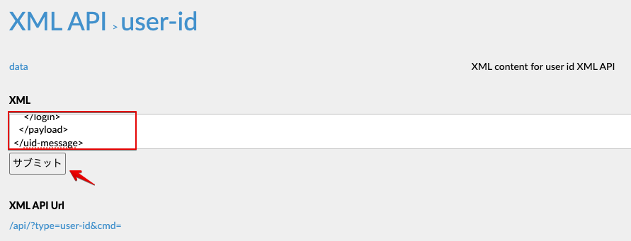- 今回は、User-ID情報を設定するので「ユーザーID」をクリックします。以下の様な画面が表示されるので、XML構文を貼り付けてサブミットします。