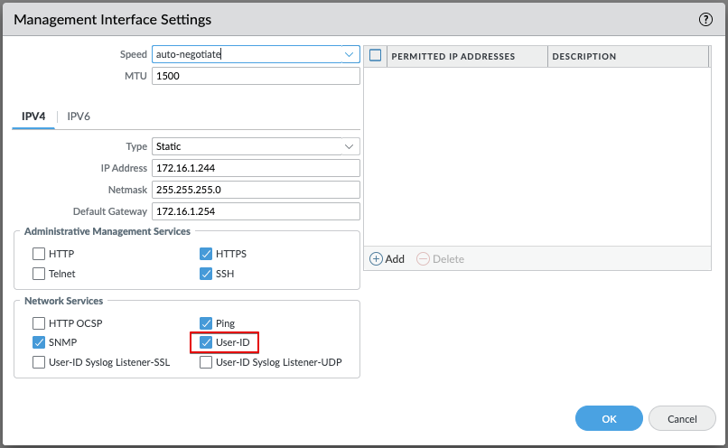 - Network Services(ネットワークサービス)で、User-ID にチェックを入れます。