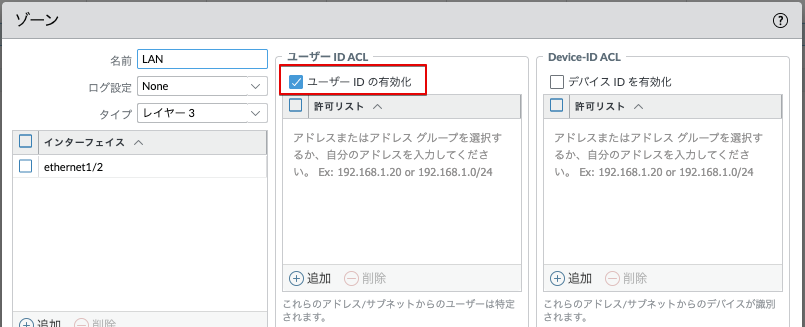 事前にUser-IDを利用したいゾーンでUser-IDを有効化してください