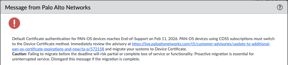 従来PAシリーズがURL Filteringで利用するPAN-DB等の旧来のセキュリティサブスクリプションで使用する通信の認証には、その筐体内にデフォルトでインストールされている証明書が利用されていました。一方で、Advanced Threat Prevention、Advanced URL Filetering等の新しい機能を利用する場合は、その認証にデバイス証明書が利用されています。この仕様が変更になり、2026年2月11日以降はデフォルトの証明書は利用できなくなり、デバイス証明書のみを参照するようになります