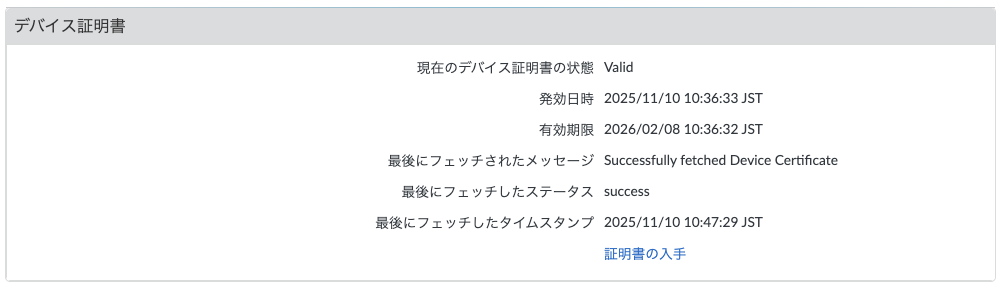 【DEVICEタブ】→【セットアップ(Setup)】→【管理(Management)】→【デバイス証明書(Device Certificate)】を確認してください。第三世代と第四世代で若干表示が異なる場合がありますが、以下のように発行日等や有効期限に問題がなく、その他エラーのない表記になっていれば問題ありません。